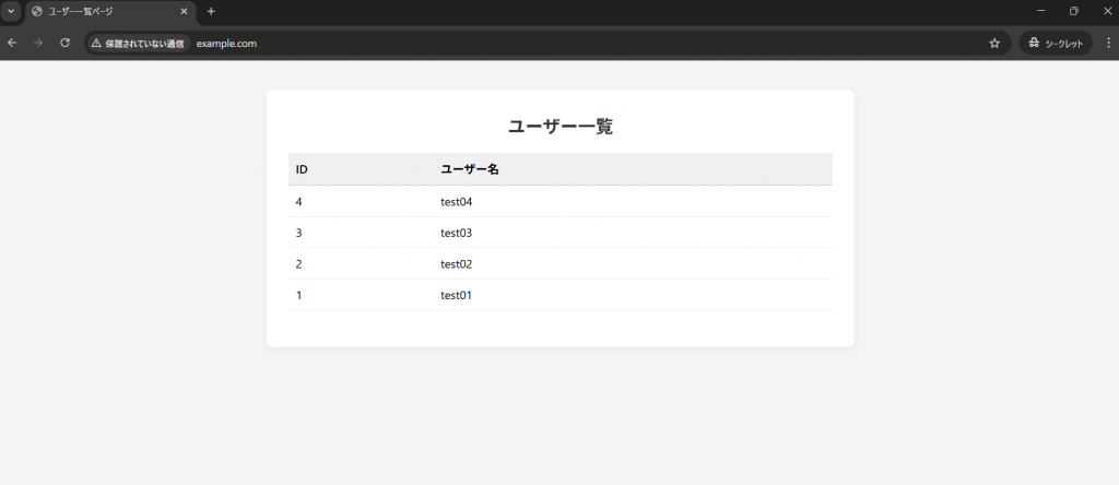 → 独自ドメインでアクセスすると表示される画面であり、dbから取得したユーザーIDと名前が表示されるようにしています